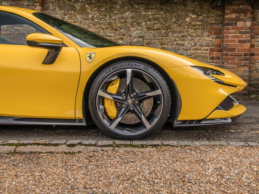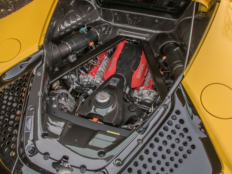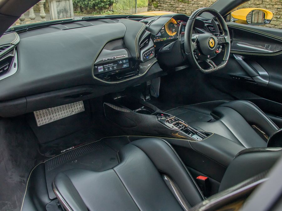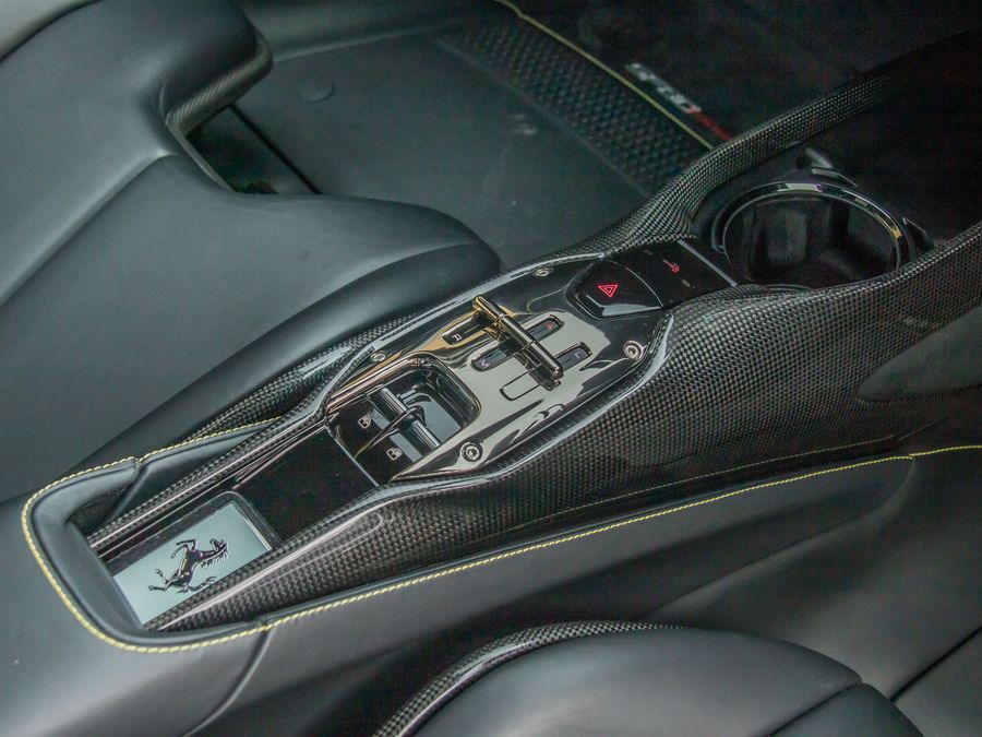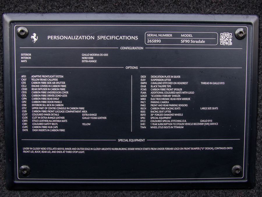 Carbon Fibre Racing Seats (Large Size) with Racing Seat Lifter, 20" Forged Diamond Wheels, Extensive Carbon Fibre Package (including Front Spoiler, Rear Diffuser, Side Air Splitter, Engine Covers, Door Panels, Dash Inserts, Centre Console Trim, Rear Shelf, Front Luggage Compartment Trim and Hub Caps), Suspension Lifter, Special Livery in Glossy Nero Stellato with Argento Nürburgring Accents, Scuderia Ferrari Shields, Adaptive Frontlight System, Electrochromic Rear-View Mirror, Parking Camera with Front and Rear Sensors, Yellow Brake Callipers, Cavallino Stitched Headrests with Giallo Thread, Special Giallo Stitching, Coloured Inner Details in Extra-Range Leather, Coloured Seat Belts, Leather/Alcantara Mats, Additional Coloured Mats with Logo, Black Tailpipe Tips, Titanium Wheel Stud Bolts, Dedication Plate in Silver, Stolen Vehicle Recovery Subscription, Special Equipment Package.